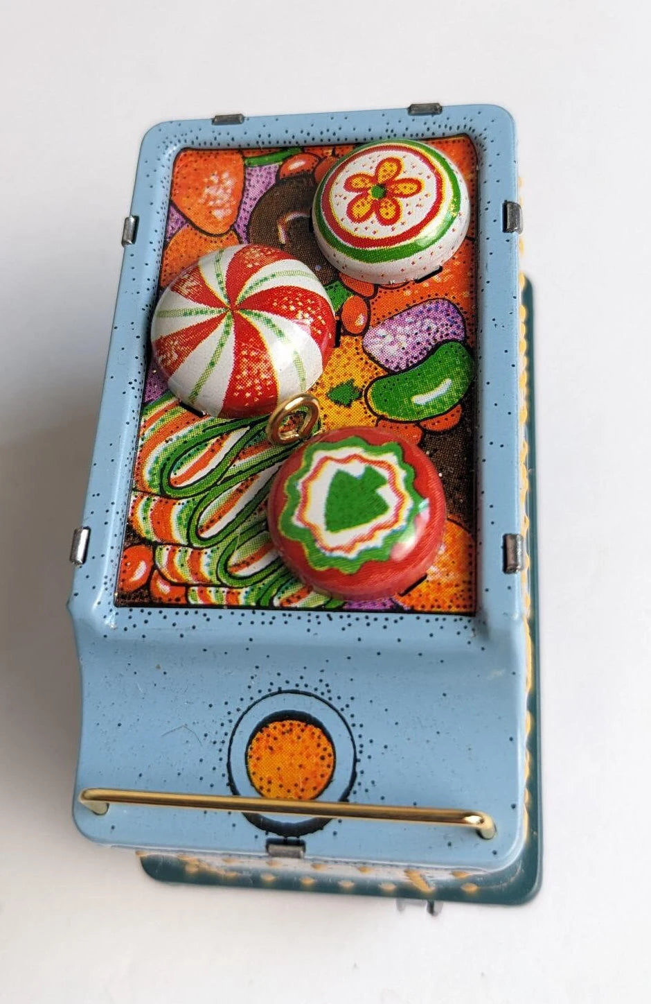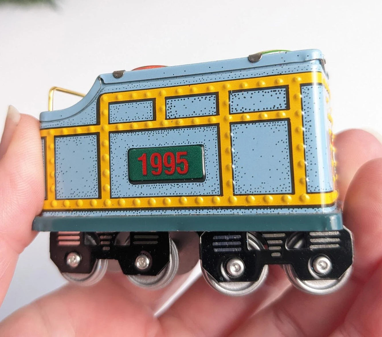 Beautiful Vintage Hallmark Yuletide Central Christmas Ornament. This tin Tender Car ornament is gorgeous with vibrant colors and details and the wheels even move. Perfect for the train or candy fan in your life.