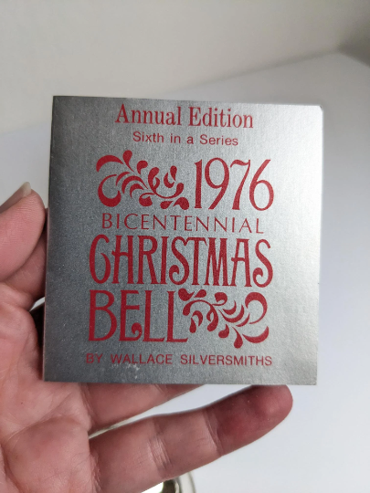 Vintage 1976 Wallace Silversmiths Bell Silver Plated Christmas Ornament, 6th in the series. Wow, this is a rare find! Wonderful detail in this bell ornament featuring poinsettias, eagles and liberty bells. It is in great condition with light scratches and spotting from normal use and storage.