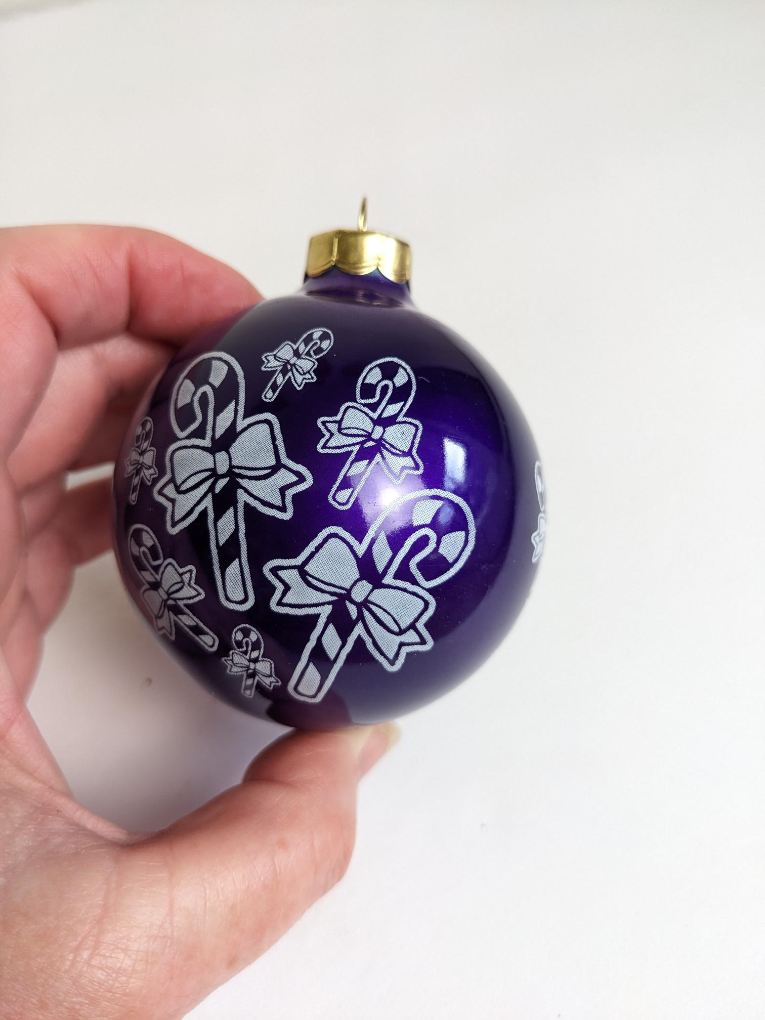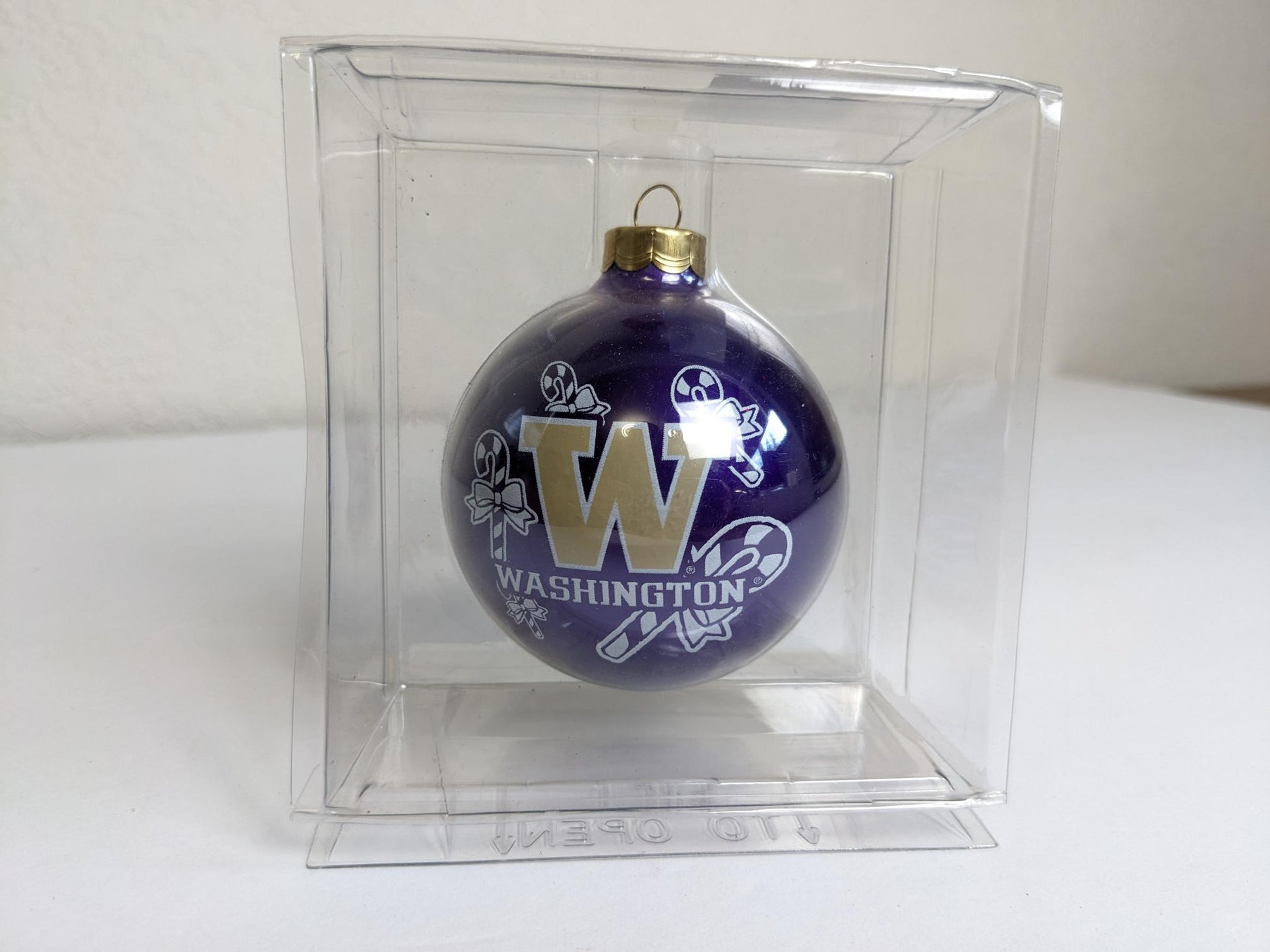 Washington Huskies Glass Ball Christmas Ornament. This is a rare find! Featuring a purple ornament with candy canes, very nice. Perfect for the Huskies fan in your life. It is in great condition with no chips or cracks.