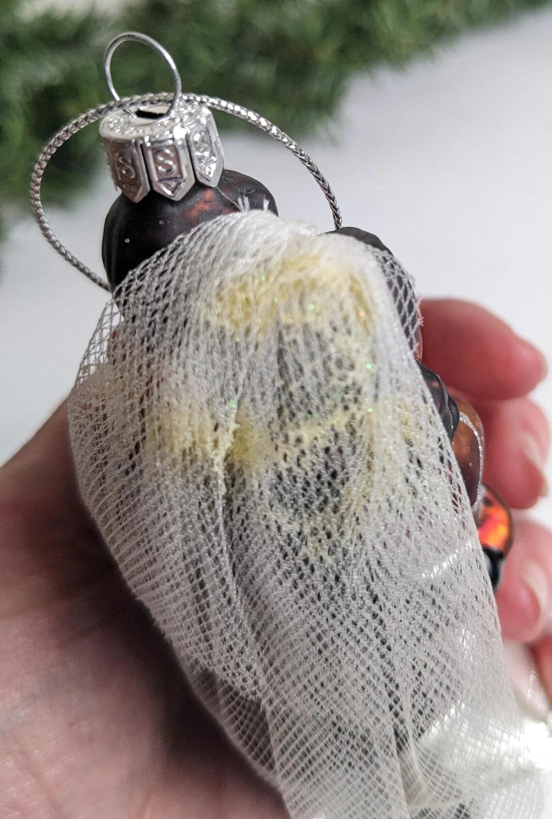 It does have some glue residue around the brides vail, please see last picture. Would look fantastic on any Christmas tree or wreath. Wonderful addition to your vintage ornament collection. Hurry we only have 1 in stock!
