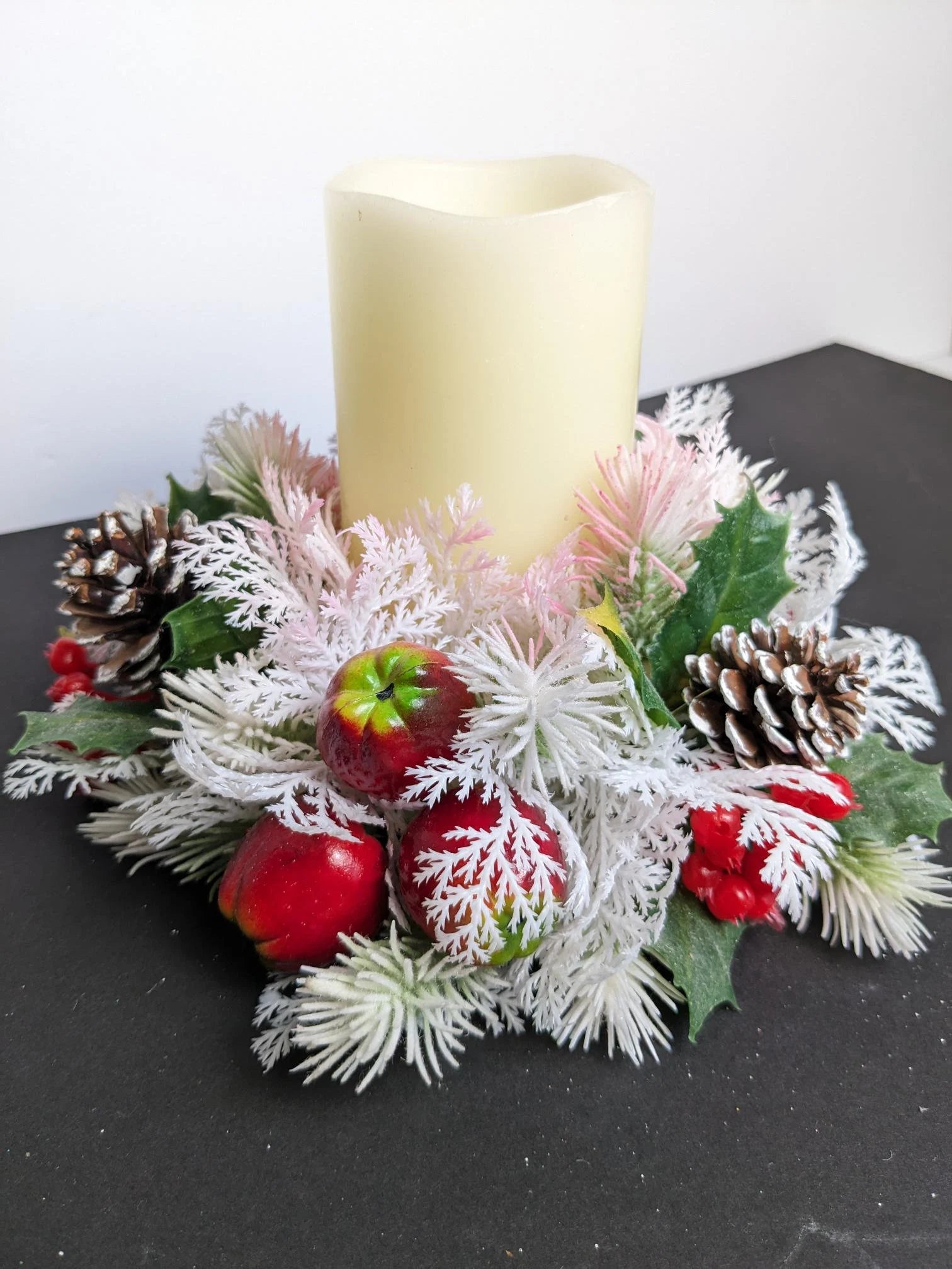 Vintage plastic candle wreath ring. This gorgeous retro candle ring features apples, holly and pinecones set in pretty plastic white foliage. It is in great condition with some red staining around where the candle goes, I am guessing someone displayed this with a red candle previously.