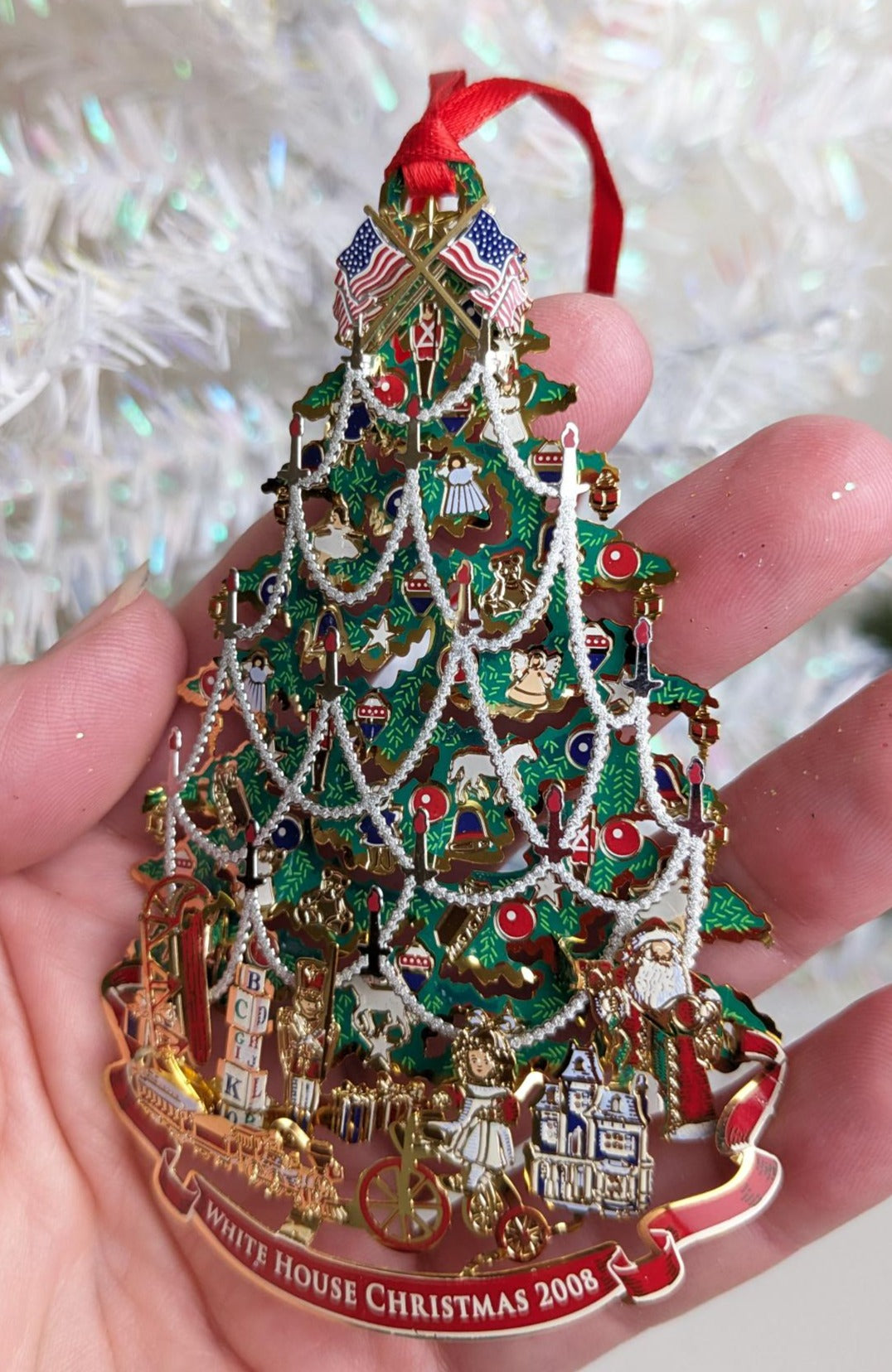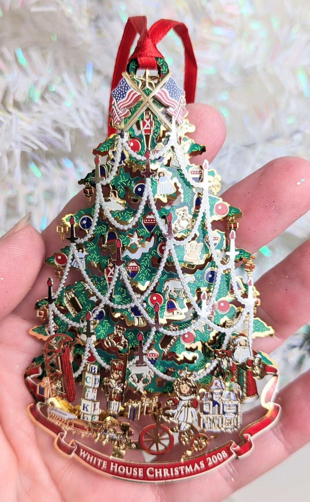 Gorgeous 2008 White House Christmas Tree Christmas Ornament. What a rare find and absolutely beautiful with wonderful detail and color. Perfect for anyone this holiday season.