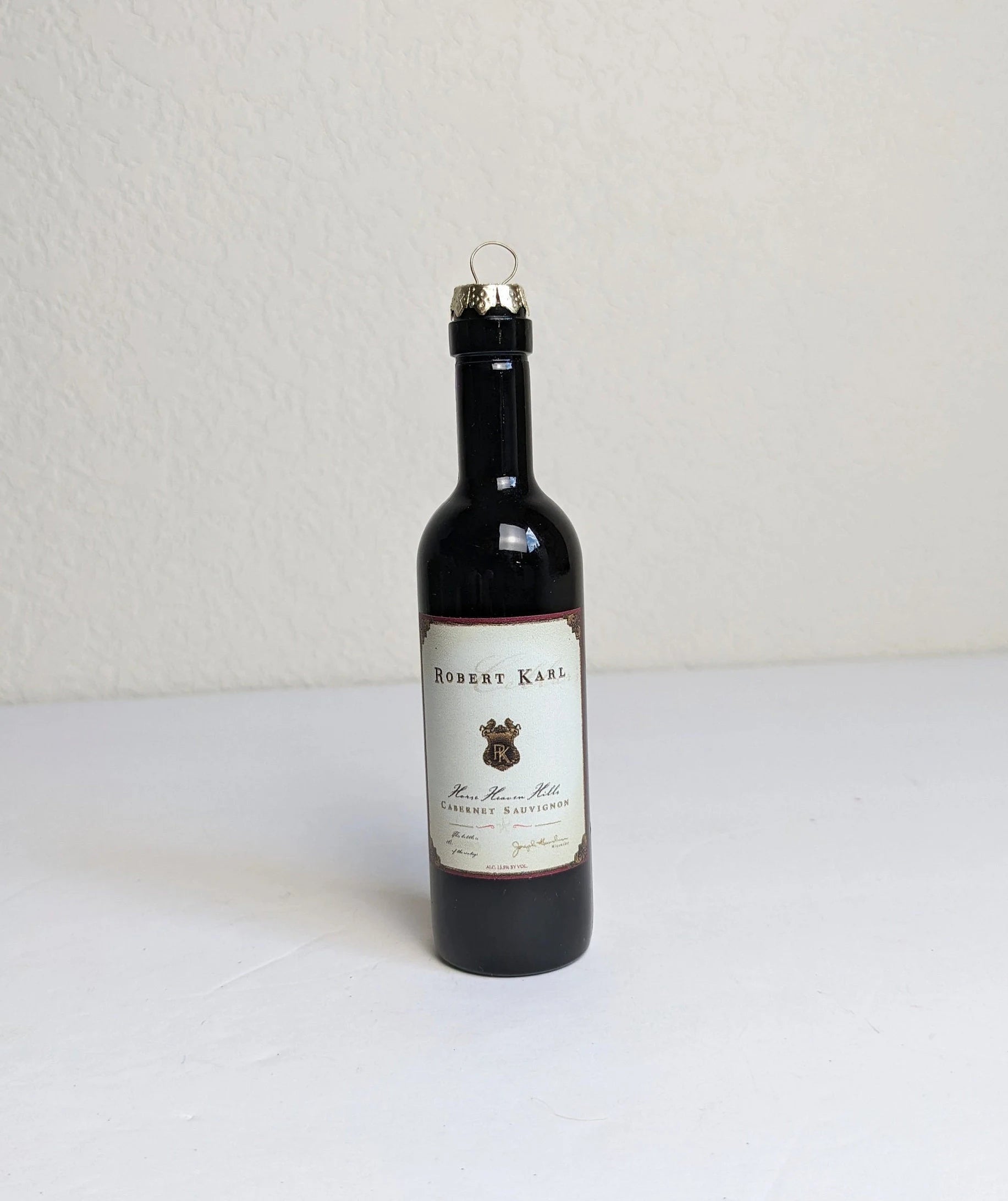 Robert Karl Cabernet Wine Bottle Glass Christmas Ornament. What a rare find! This beautiful ornament features a glass wine bottle with a Robert Karl Cabernet label, very pretty.
