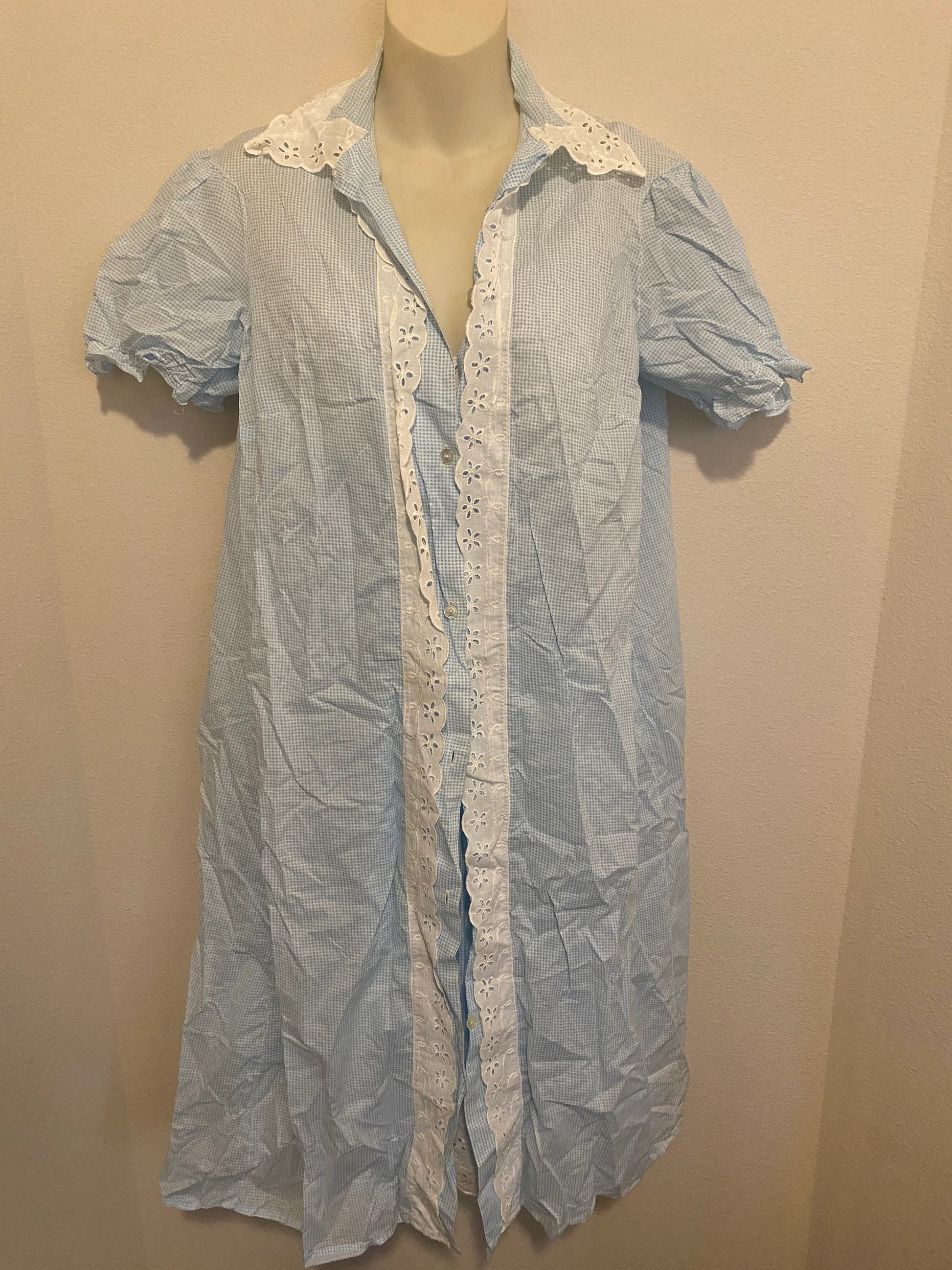 Description: Vintage Tempo Lingerie Nightgown with Matching Robe. Lounge Wear. As you can see from pictures, the night gown is light blue and white checkered below the bust and the bust and bottom edging of the gown is white lace. The matching robe is mainly light blue and white checkered like the night gown and the button up portion of the robe is lined with white lace as well.